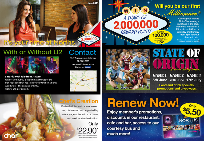 For Norths we produced a bi-monthly magazine that was delivered to the surrounding suburbs and contained the upcoming events, specials and also reported on other stories that were happening in the club like their White Ballon Day. The majority of the photography in the magazine and on the website was completed by us at PCA and you could definitely see the results of what strong photography is capable of in marketing a venues facilities and food to people.